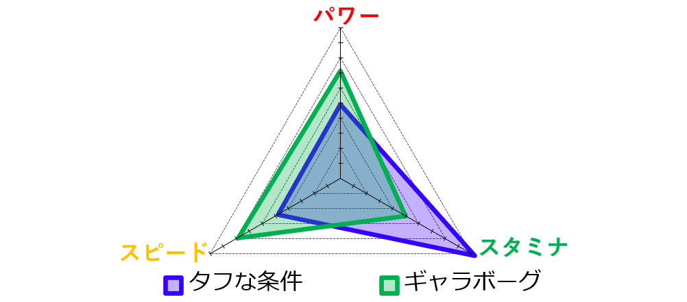 馬体:脚が長く見せ飛びの大きそうな馬体でスタミナはそれなりにあり、適性は出走馬の中では高め