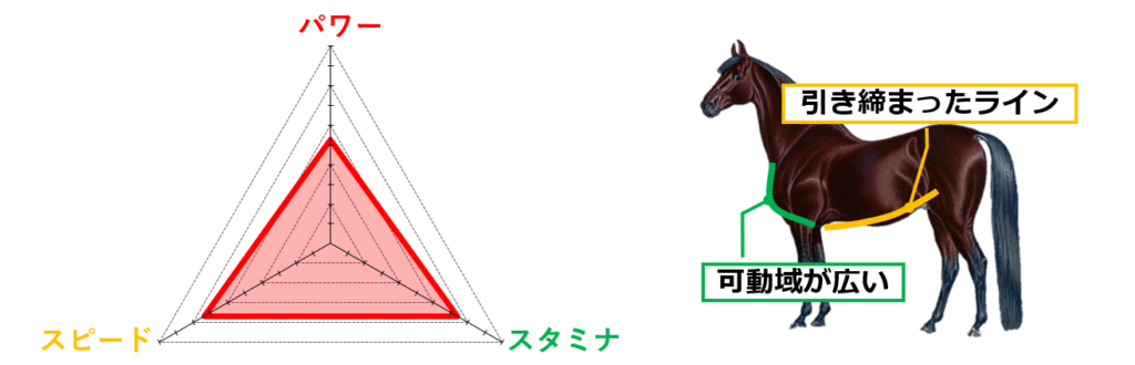 前躯の筋肉量が多い馬体はパワーよりの馬が多く、短距離やタフな馬場を得意とする馬に多い特徴です。
